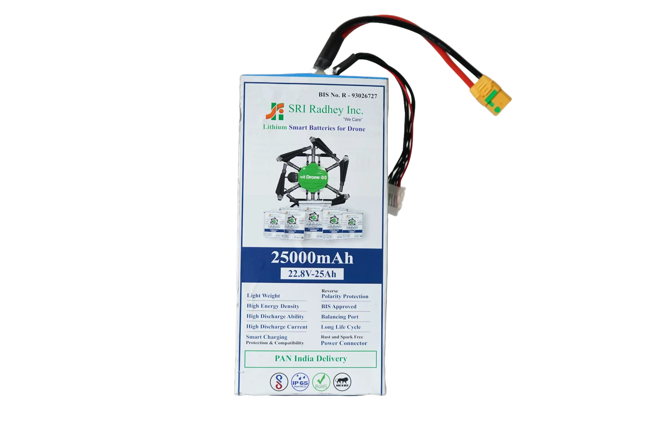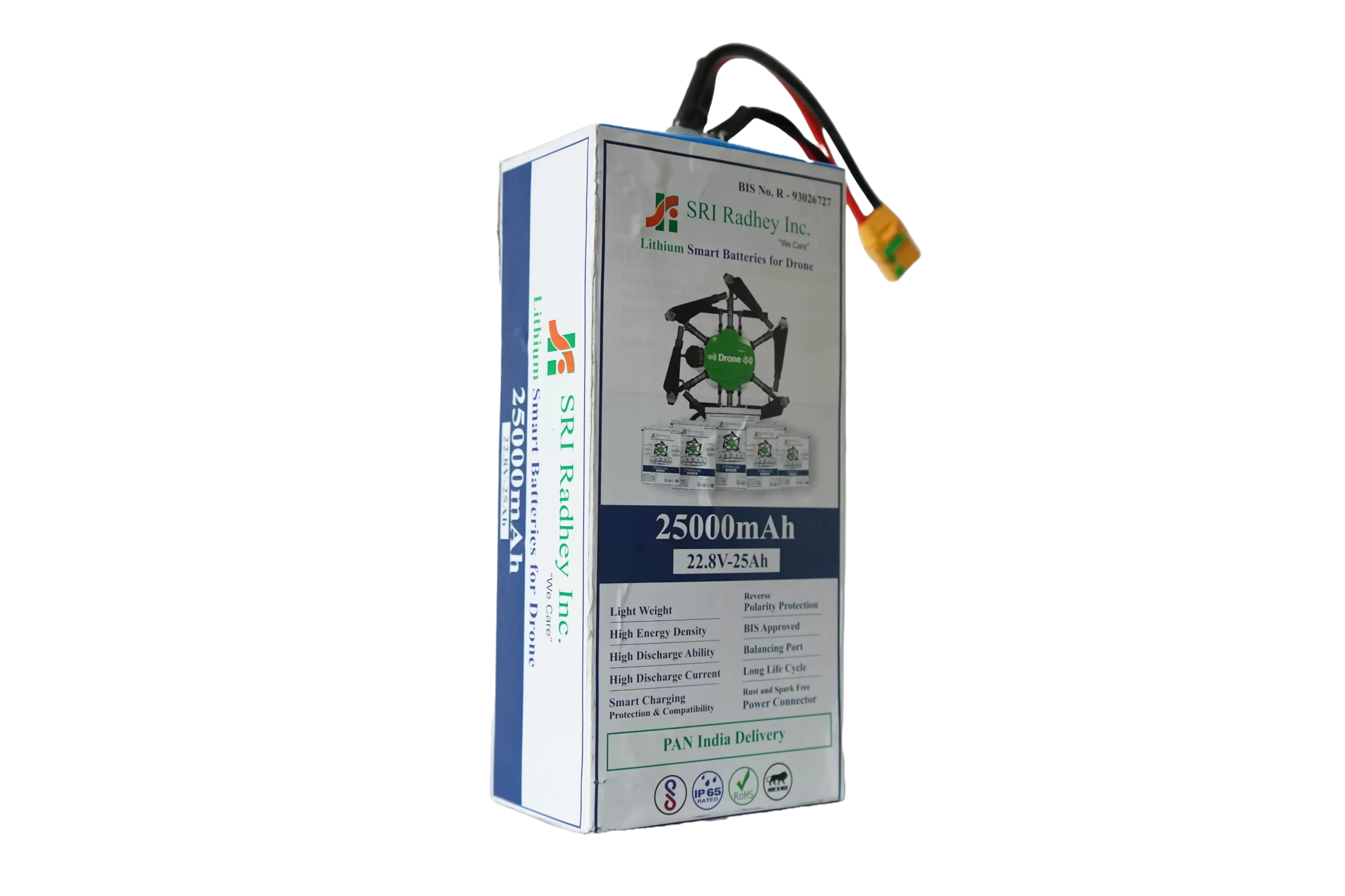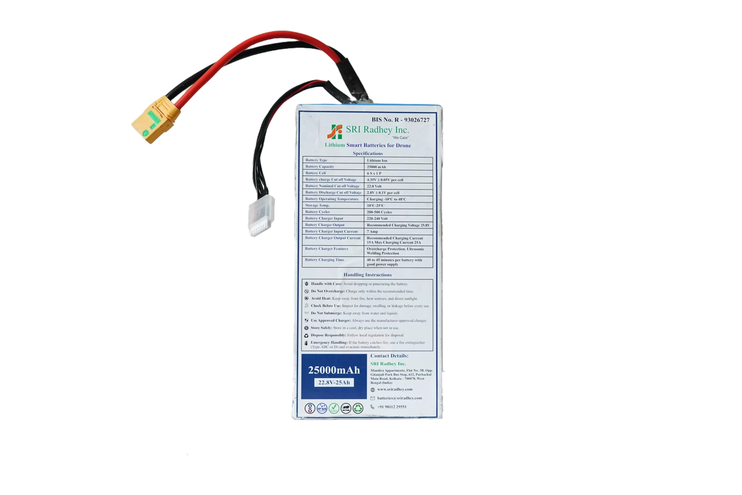 Power your drone with the reliable and efficient 25000mAh Lithium Drone Battery by SRI Radhey Inc. This high-capacity battery is designed for optimal drone performance, featuring lightweight construction, BIS-approved safety standards, and advanced charging compatibility. It ensures long cycles, high discharge ability, and robust protection for seamless drone operations.