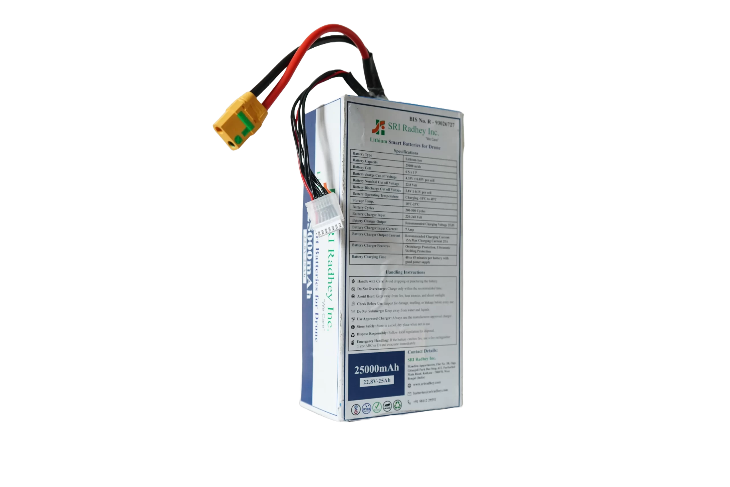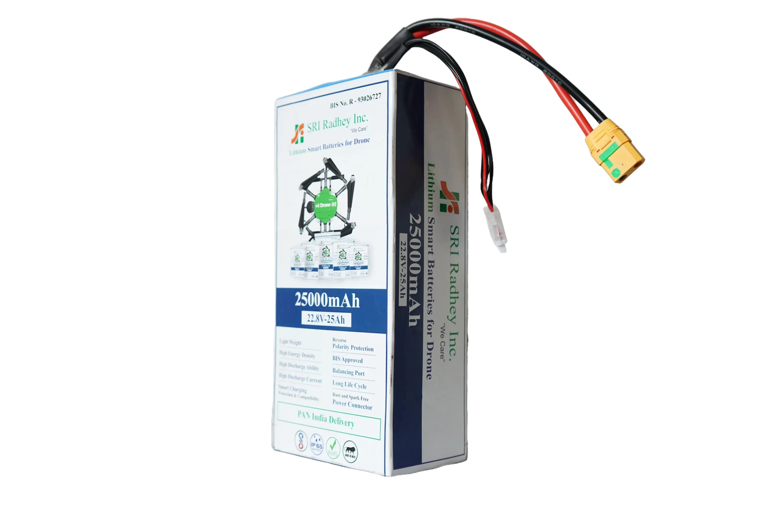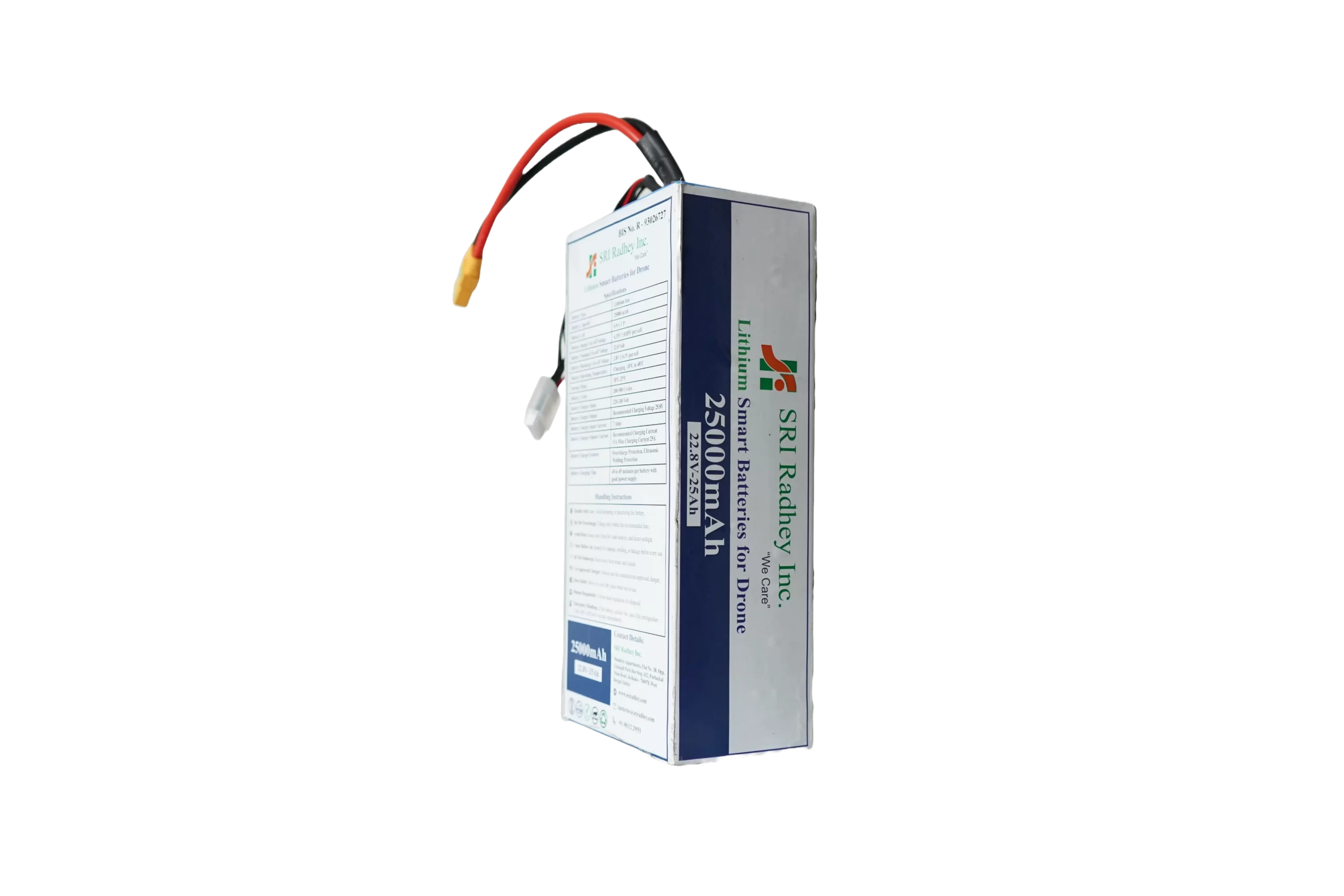 Power your drone with the reliable and efficient 25000mAh Lithium Drone Battery by SRI Radhey Inc. This high-capacity battery is designed for optimal drone performance, featuring lightweight construction, BIS-approved safety standards, and advanced charging compatibility. It ensures long cycles, high discharge ability, and robust protection for seamless drone operations.